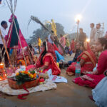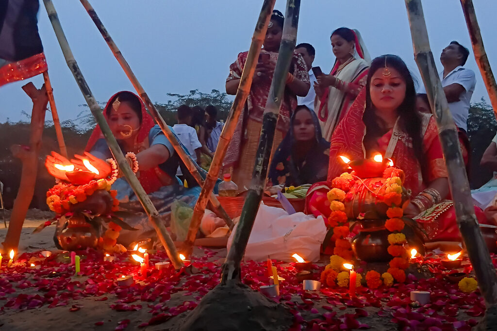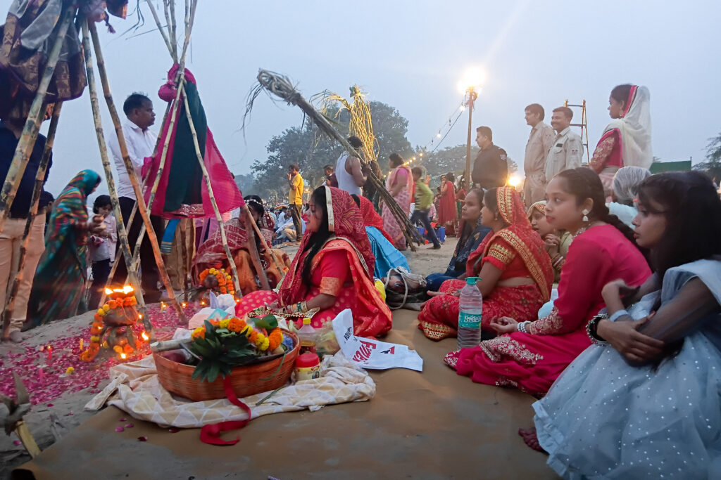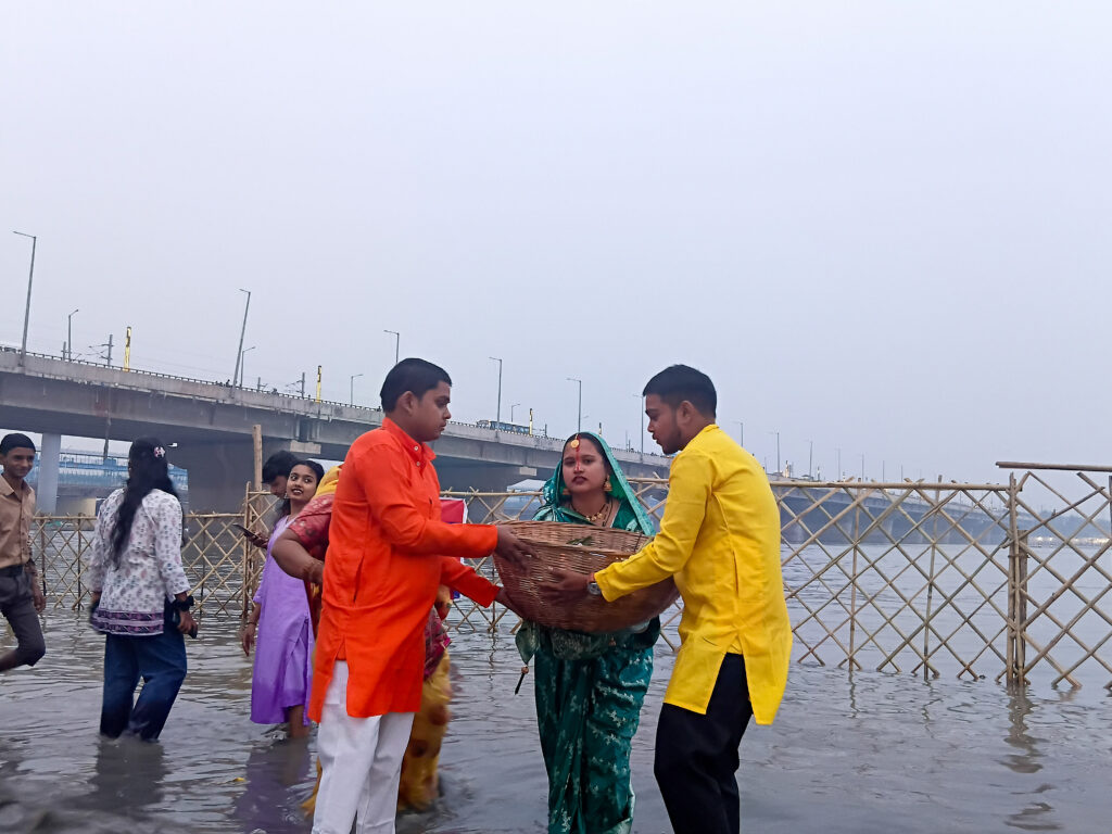 The final, fourth day, Usha Arghya, begins before sunrise. Family members and friends assemble at the ghat to offer Arghya to the rising sun, culminating the 36-hour-long nirjala fast, without food and water.