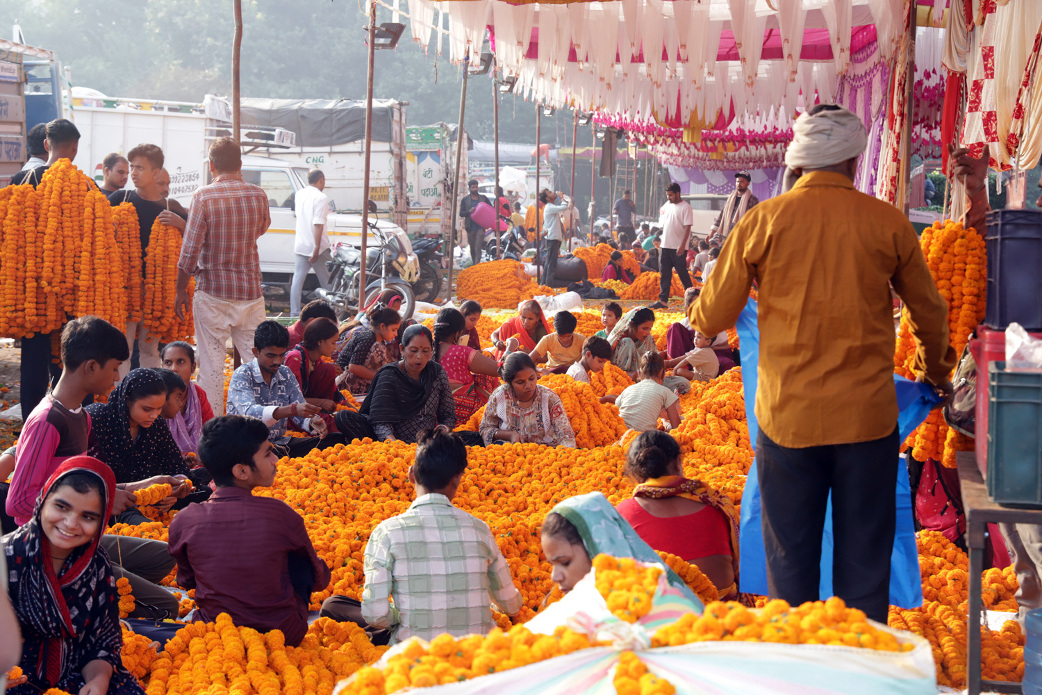 Families and workers sit amidst a vast carpet of brilliant orange marigolds in an open section of the market (Photo: Media India Group/Aman Kanojiya)