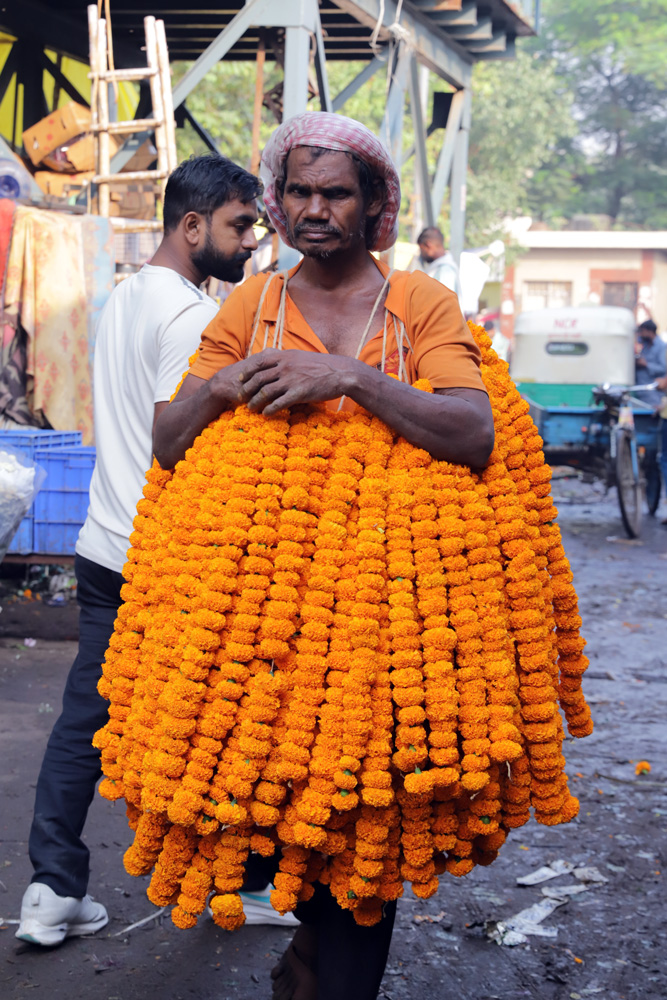 As the first rays of the sun touch the heaps of yellow and orange blooms, the market turns into a living painting.