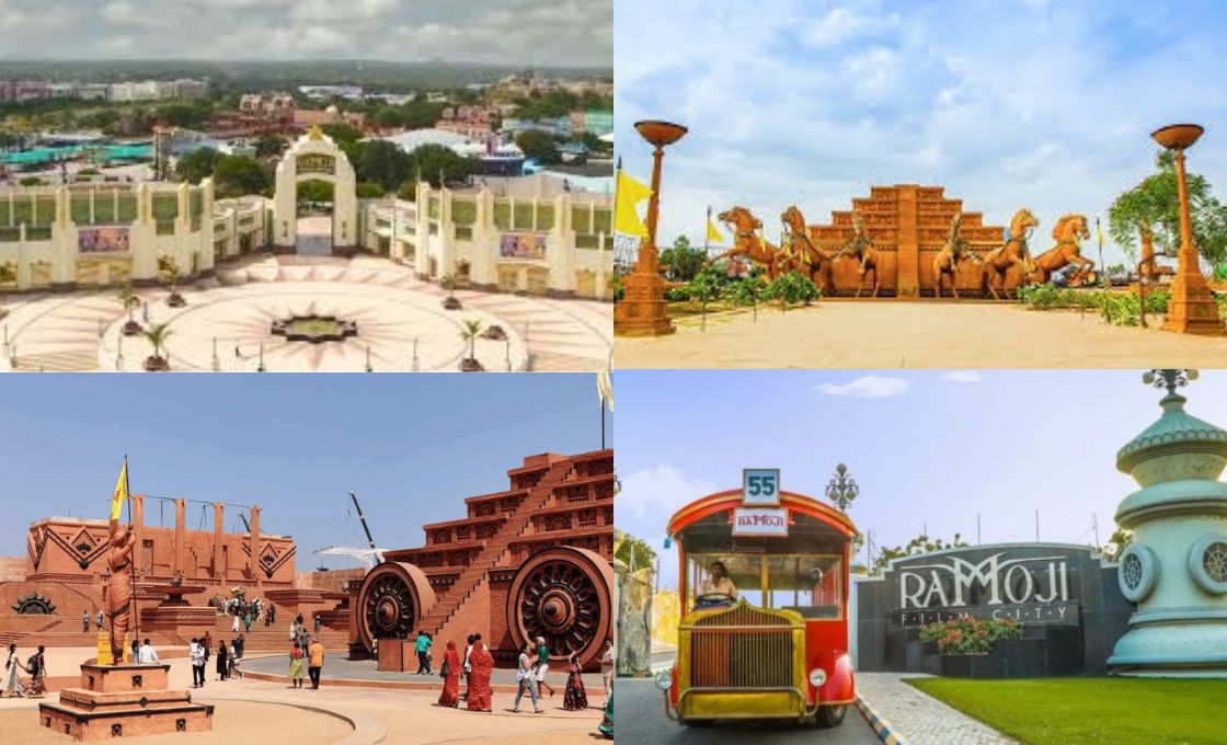 On the outskirts of Hyderabad in Telangana, Ramoji Film City operates as a sprawling cinematic city blending film production with immersive tourism experiences.